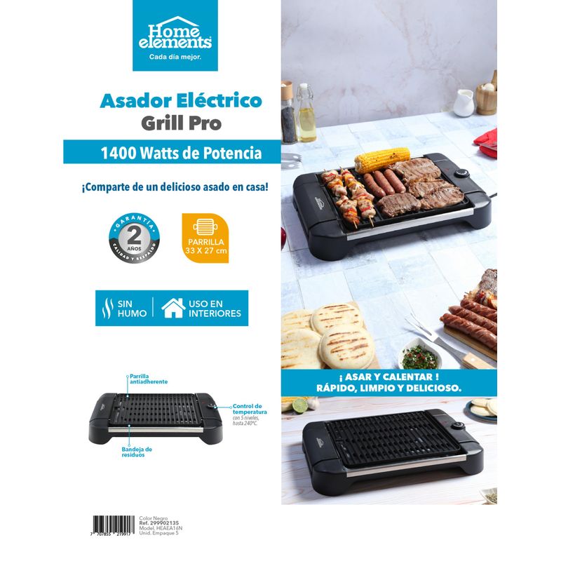 Disfruta de los mejores asados sin salir de casa con el Asador Eléctrico Grill Pro de Home Elements. Su potencia de 1400 W y control de temperatura ajustable te permiten asar carnes, verduras y arepas fácilmente, sin humo y con una cocción uniforme. Ideal para interiores, su parrilla antiadherente facilita la limpieza y su bandeja recoge grasa mantiene tu cocina impecable. ¡Asar nunca fue tan rápido, limpio y delicioso!