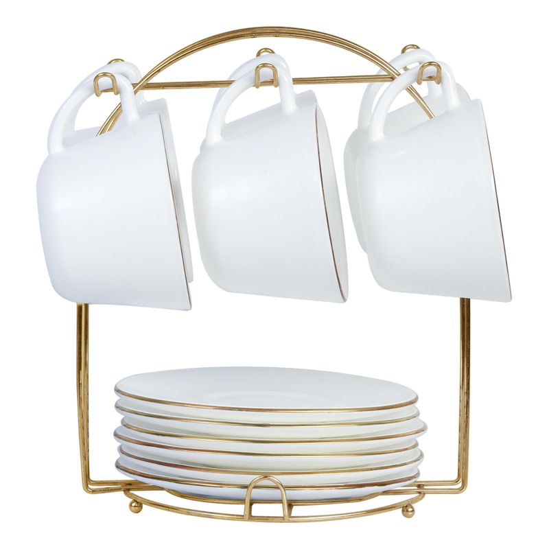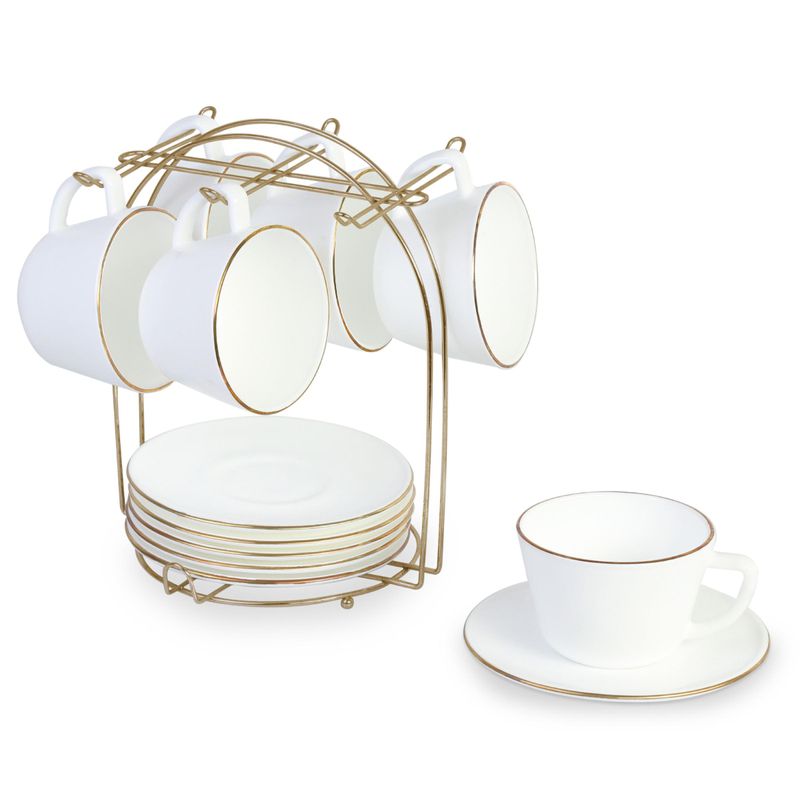 Un Juego de Té con Rack Borde Dorado elaborado en vitrocerámica, ideal para servir con estilo, y una Cafetera Eléctrica de 12 tazas perfecta para preparar café fresco en minutos.