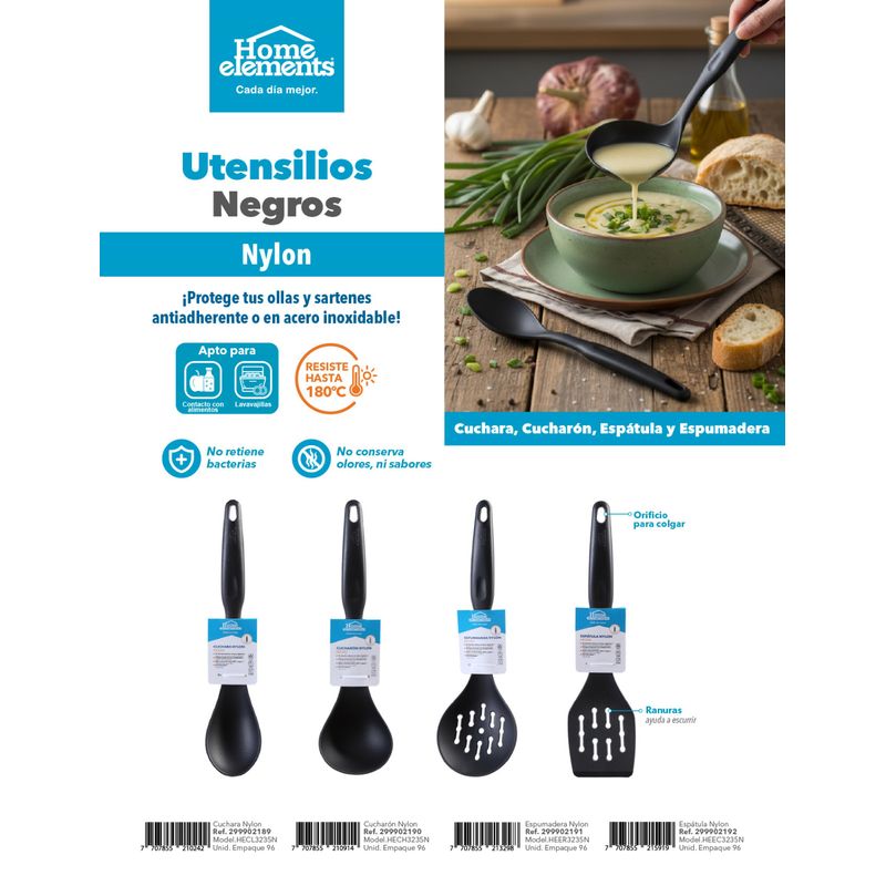 Dale un upgrade a tu cocina con los utensilios de nylon negro Home Elements. Son resistentes, livianos y cuidan tus ollas y sartenes antiadherentes gracias a su material suave y duradero. No retienen olores ni bacterias, soportan hasta 180 °C y son ideales para uso diario. Perfectos para servir, mezclar, voltear o escurrir tus preparaciones con total confianza. ¡Prácticos, higiénicos y listos para acompañarte en cada receta!
