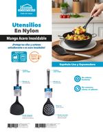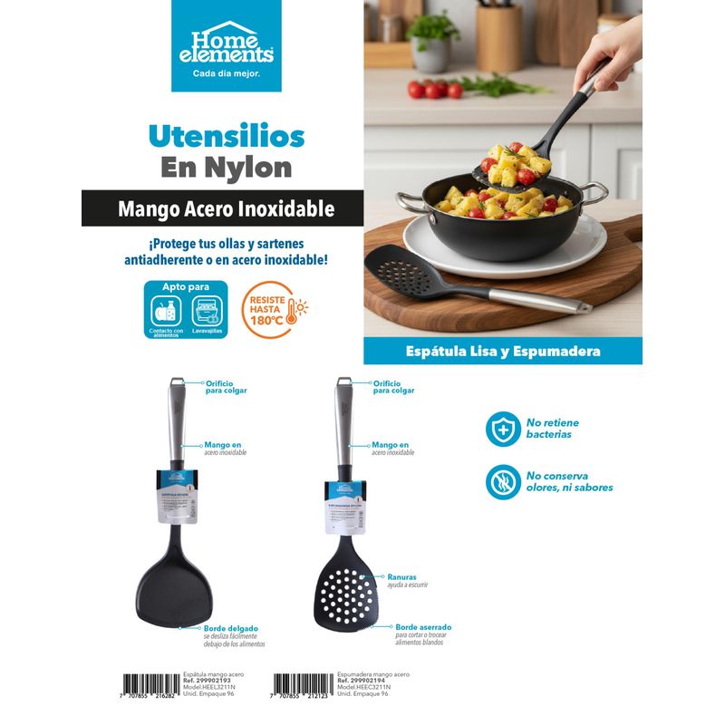 Lleva tu cocina a otro nivel con los utensilios de nylon con mango en acero inoxidable Home Elements. Son resistentes, elegantes y perfectos para proteger tus ollas y sartenes antiadherentes o de acero inoxidable. Su diseño liviano y ergonómico permite maniobrar con comodidad, mientras que el nylon soporta hasta 180 °C y evita la acumulación de olores o bacterias. Ideales para voltear, servir o escurrir tus preparaciones de manera segura y profesional. ¡Utensilios durables, higiénicos y con estilo!