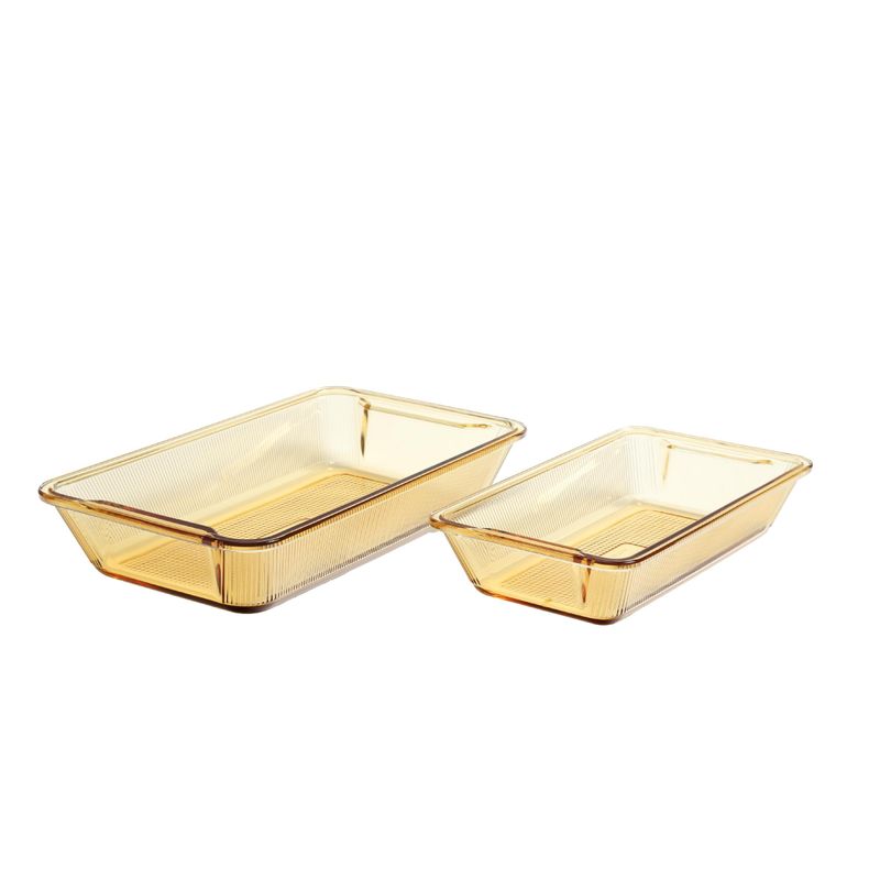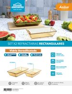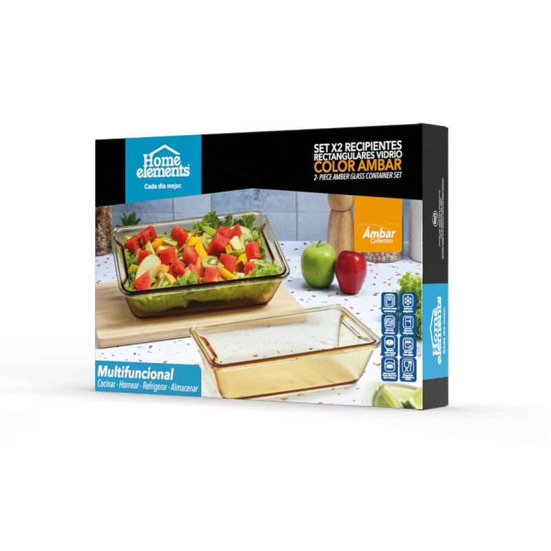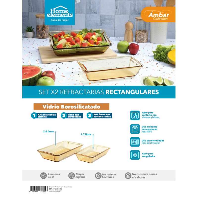 Acompañando el horno, el Set x2 Refractarias Rectangulares Ámbar está fabricado en vidrio borosilicatado de alta resistencia térmica y durabilidad. Son perfectas para hornear, refrigerar, congelar y servir directamente en la mesa con un diseño moderno y elegante.