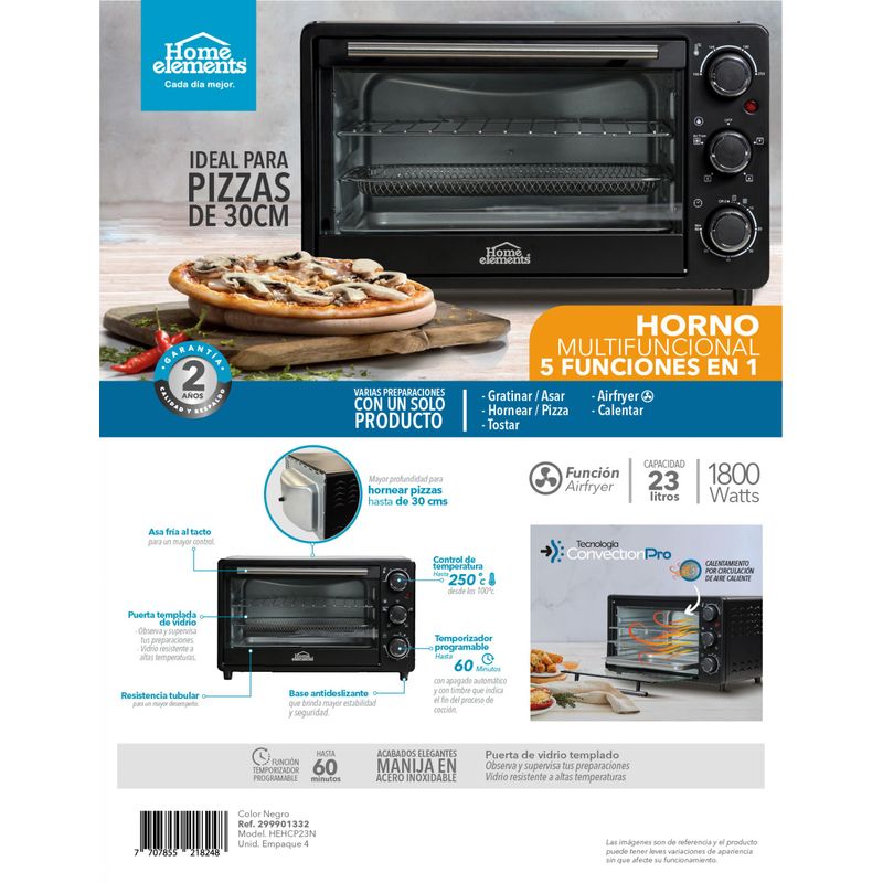 El Horno Multifuncional 5 en 1 te permite gratinar, asar, hornear, tostar y usar función Airfryer gracias a su tecnología ConvectionPro que distribuye el calor de forma uniforme. Su capacidad de 23 litros y control de temperatura de hasta 250°C lo hacen ideal para pizzas de 30 cm y múltiples preparaciones.