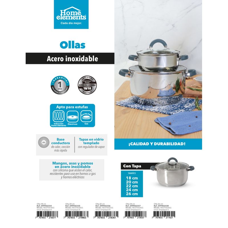 La olla en acero inoxidable Home Elements es perfecta para preparar tus recetas diarias con confianza y eficiencia. Fabricada en acero inoxidable 18/10, ofrece alta resistencia al óxido y una cocción uniforme gracias a su base conductora de calor. Incluye tapa en vidrio templado con regulador de vapor, ideal para conservar el calor y los sabores, garantizando calidad y durabilidad en cada uso.