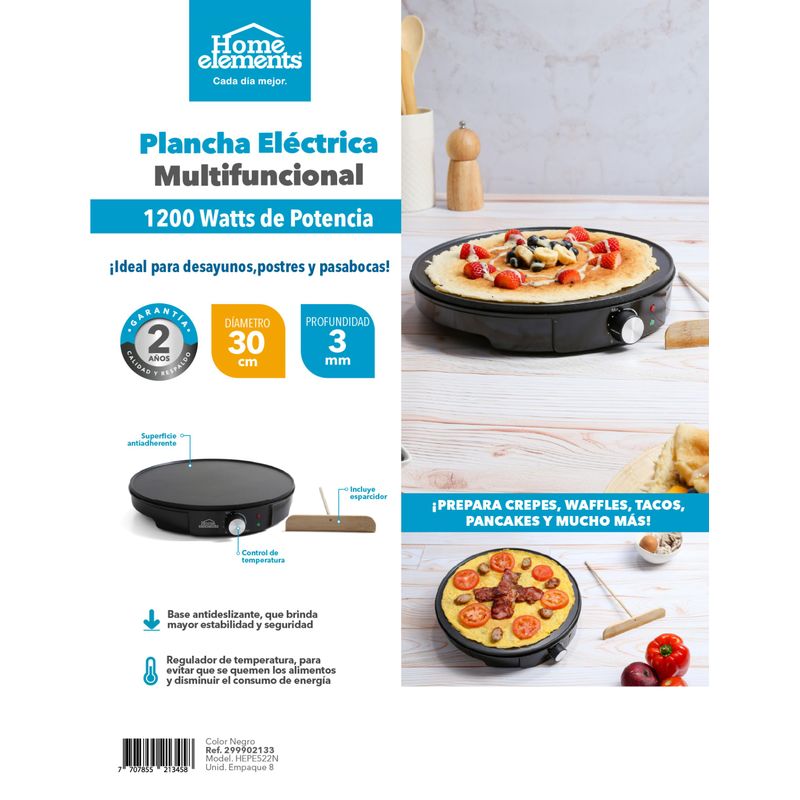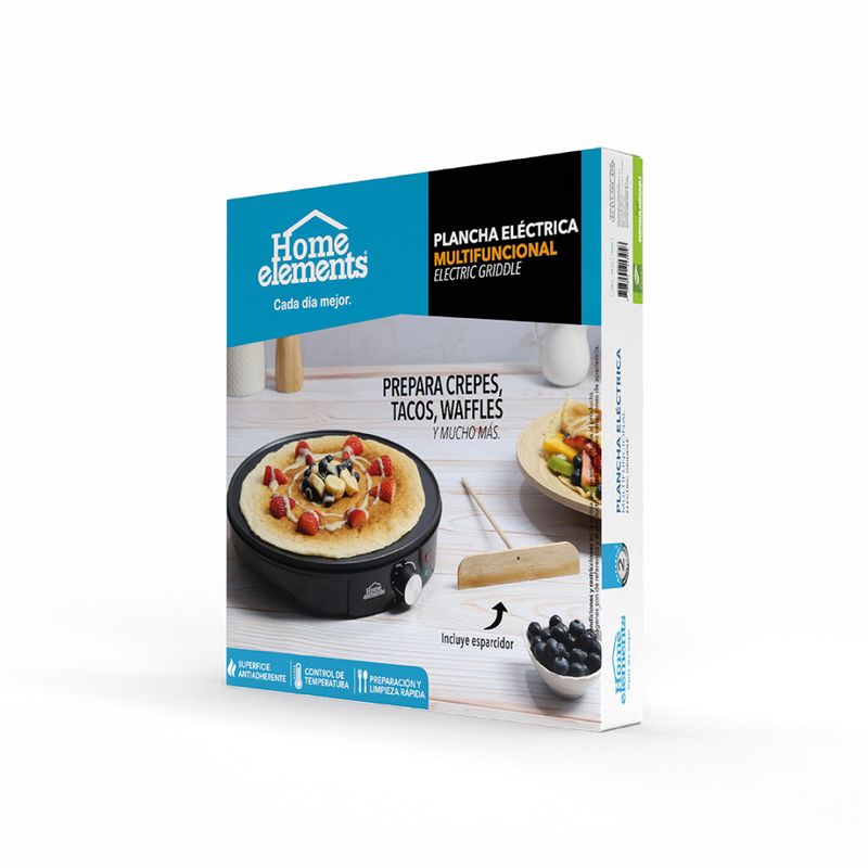 Haz que tus desayunos y pasabocas sean inolvidables con la Plancha Eléctrica Multifuncional Home Elements. Con 1200 watts de potencia, te permite preparar crepes, waffles, tacos, pancakes, arepas y mucho más, de forma rápida y uniforme. Su superficie antiadherente evita que los alimentos se peguen y facilita la limpieza, mientras que su control de temperatura te ayuda a cocinar sin quemar y a optimizar el consumo de energía. Incluye esparcidor de masa para lograr crepes perfectos y cuenta con base antideslizante que brinda estabilidad y seguridad. ¡La herramienta ideal para quienes aman cocinar fácil, rápido y delicioso!