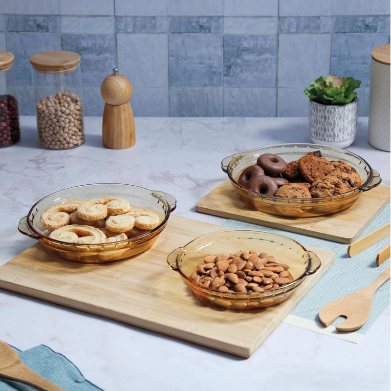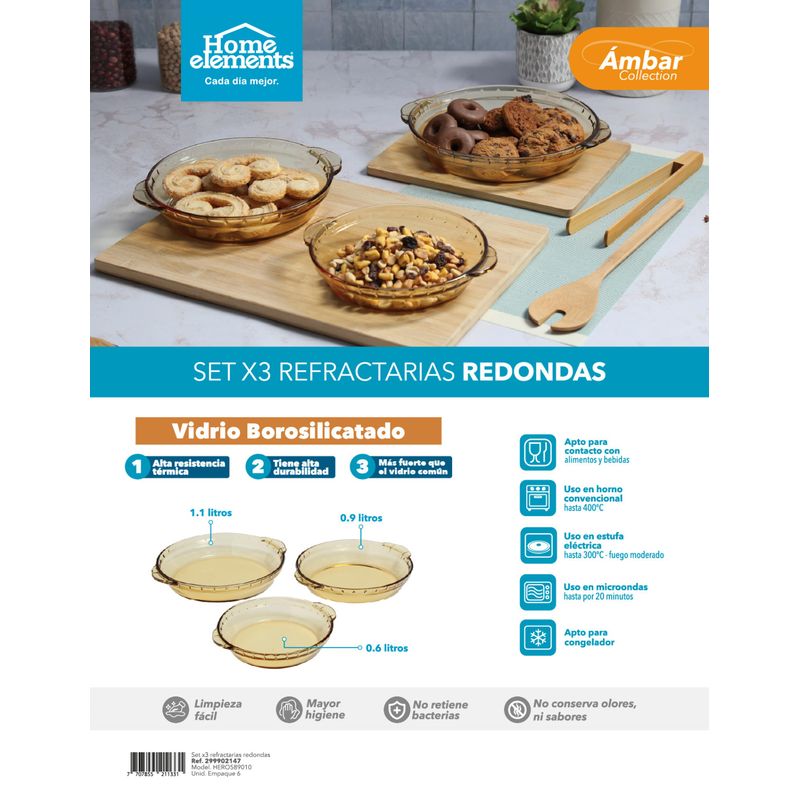 Prepara, sirve y conserva tus recetas favoritas con el Set x3 Refractarias Redondas Ámbar Home Elements. Fabricadas en vidrio borosilicatado de alta resistencia térmica, son perfectas para hornear, calentar en microondas o usar en estufa eléctrica. Su diseño elegante en tono ámbar realza tu mesa y su practicidad las hace indispensables en la cocina. Además, son fáciles de limpiar, no retienen olores ni bacterias y son seguras para el congelador.