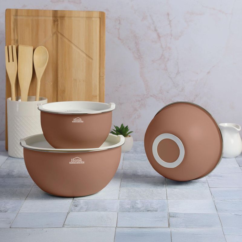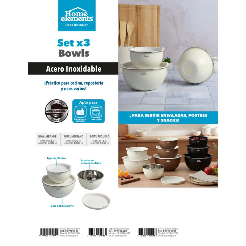 Organiza, prepara y sirve tus comidas como un profesional con el Set x3 Bowls en Acero Inoxidable de Home Elements. Su interior resistente y antihumedad conserva mejor tus alimentos, mientras que su exterior con tapa plástica mantiene todo fresco y protegido.
