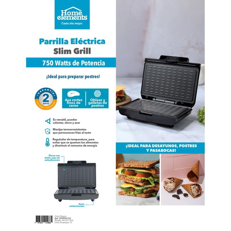 Descubre la Parrilla Eléctrica Slim Grill de Home Elements, tu aliada perfecta para preparar desayunos, postres y pasabocas en minutos. Con 750W de potencia, alcanza la temperatura ideal para dorar, calentar y sellar tus alimentos fácilmente.