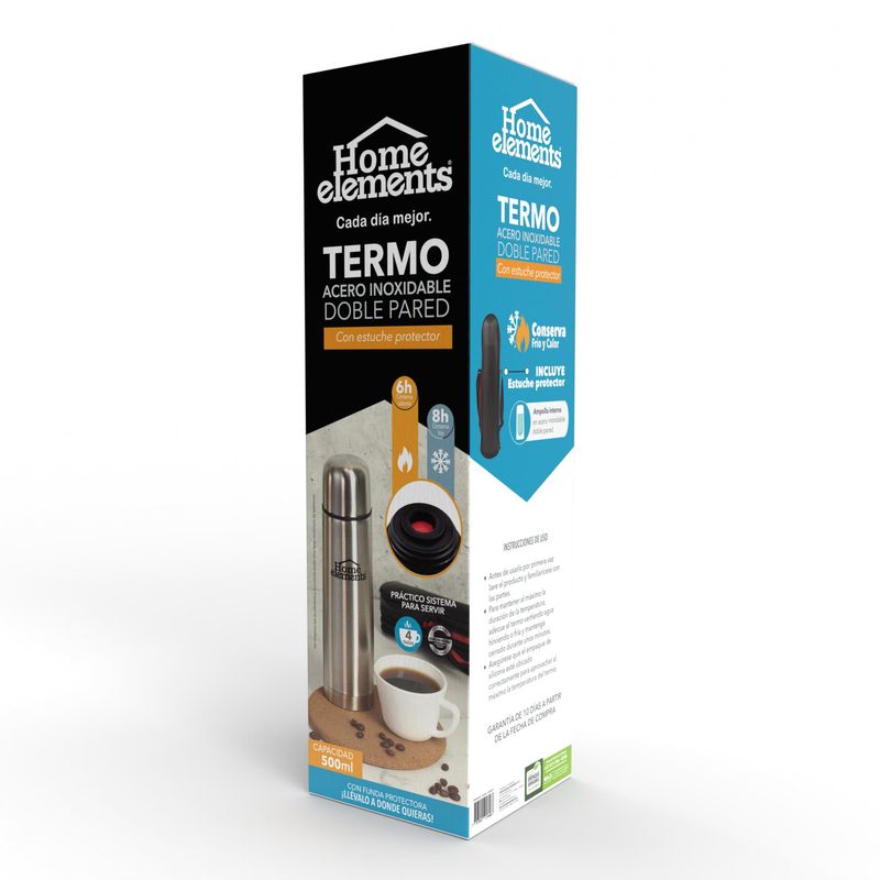 El Termo Acero Inoxidableidable o,5 litros, conserva la temperatura por más tiempo. Es ideal para llevar a todas partes, gracias a su funda protectora, que facilita el transporte y lo protege.