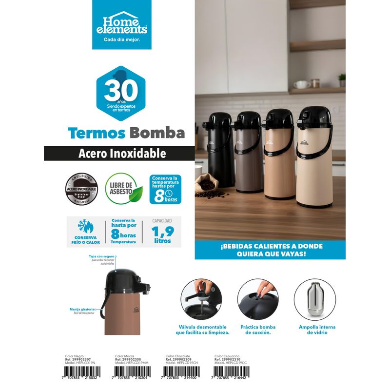 Lleva tus bebidas siempre a la temperatura ideal con el Termo Bomba Home Elements. Fabricado en acero inoxidable, conserva el calor o el frío hasta por 8 horas, ideal para oficinas, reuniones o viajes. Su práctica bomba de succión permite servir fácilmente sin levantar el termo, y su válvula desmontable facilita una limpieza rápida y segura. Con diseño moderno, manija giratoria y tapa con seguro, es la combinación perfecta entre estilo, durabilidad y comodidad. ¡Disfruta tus bebidas donde quieras con Home Elements!